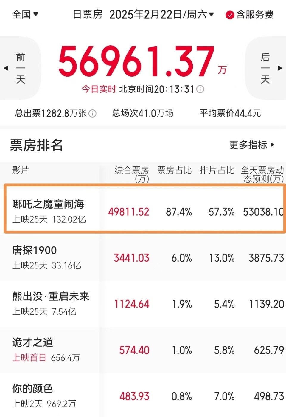 而上映第25天的《哪吒2》,周六还能再揽5亿多票房,内地总票房已经达到了132亿了。